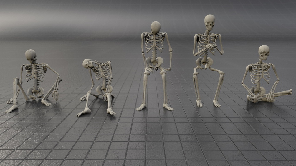 The texture for the skeleton is 2048x2048, which includes: diffuse, gloss, specular and normal. The floor texture and normal are 1024x1024. Individual poses are included in the zip-file. As well as all poses combined into one file so use whichever one suits your needs.